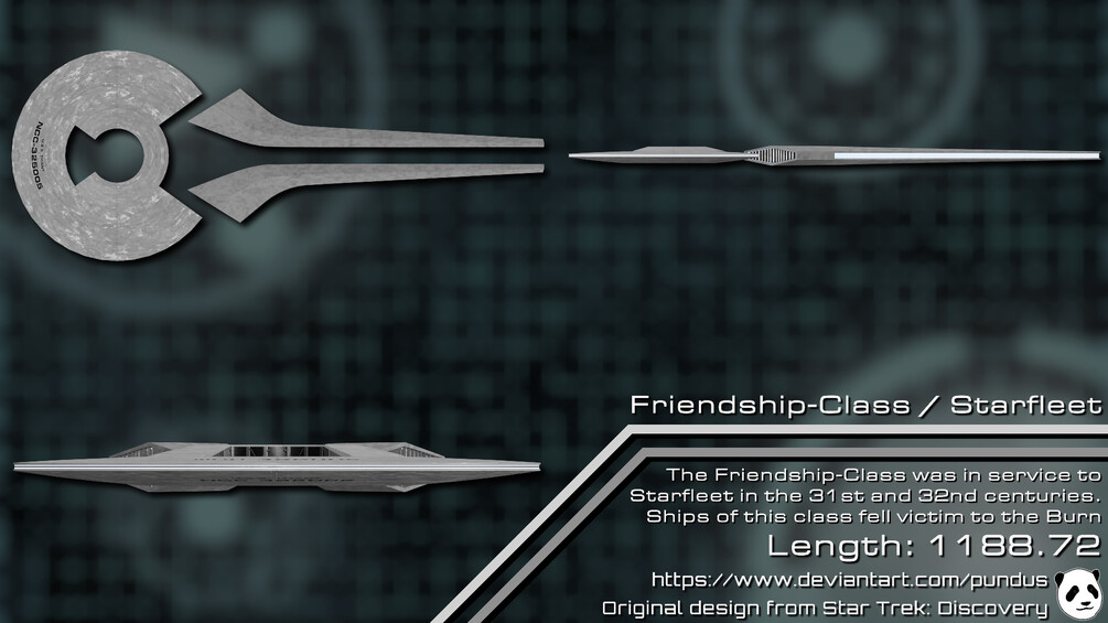 The Friendship-Class was one of several ships seen in the diverse fleet docked at Federation Headquarters in the Discovery Season 3 episode Die Trying. A design from before The Burn in the 31st century, it utilized contemporary technology such as floating nacelles behind a disconnected hull. Not much is known about the ship beyond that. It was designed by Daniel J Burns.