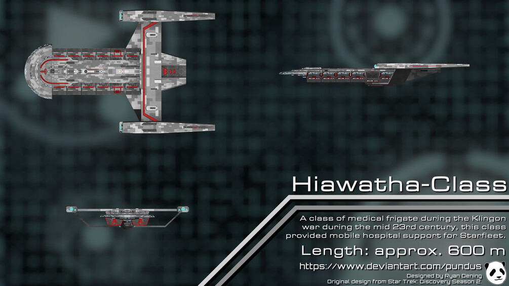 Classed as a medical frigate, the Hiawatha-Class saw service during the Klingon War of 2256. In the Star Trek: Discovery Season 2 premiere, Brother, we see a ship of this class, the USS Hiawatha, crash landed on an interstellar non-baryonic asteroid. The Hiawatha was crewed only by Jett Reno who cared for those too injured to evacuate before being rescued by the USS Discovery. By the 32nd century, ships of this class still existed, albeit wrecked, such as the hulks in orbit of the Hunhau salvage yard. This ship was designed by Ryan Dening.