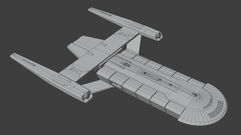 Comes as a packed Blender file with 4096 PBR textures. An FBX export is included. Textures are also included, including a registry for the USS Li Tieguai, a ship canonical to Star Trek Online.. The packed Blender files has the materials set up for rendering in Eevee. The native Blender file also includes animation for the bussards using keyframed and looping nodes.