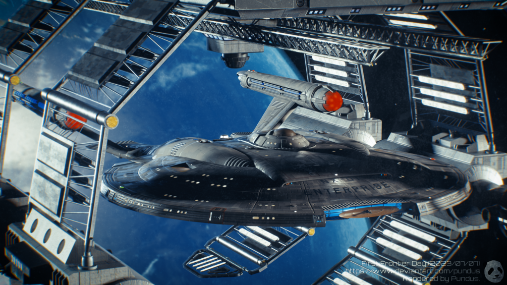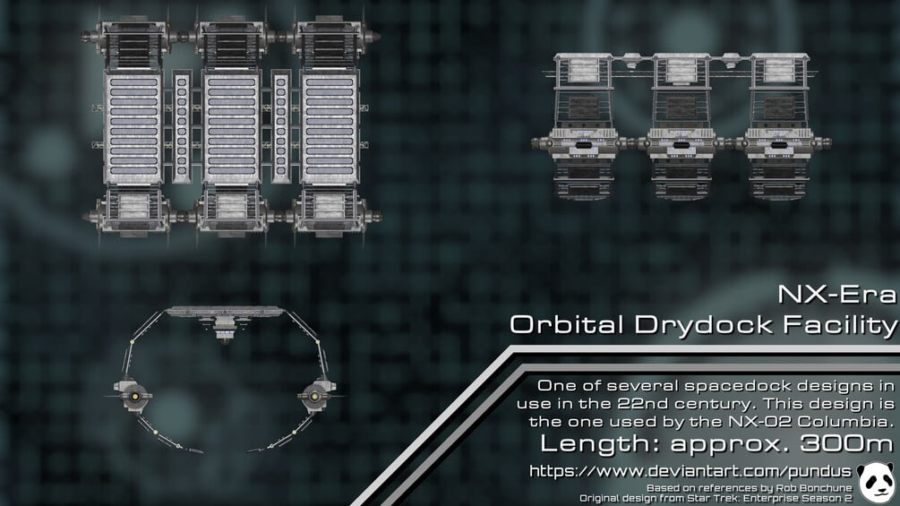 Similar in design to other famous Federation Starfleet shipyards seen in use throughout Star Trek, such as at Utopia Plantia in Star Trek: Voyager, housing the Enterprise in Star Trek The Motion Picture, and used for the Voyager-J in Star Trek: Discovery, the NX-era Orbital Drydock Facility was the first of that design in the canon chronology. This particular model is based on the one seen in use constructing the NX-02 Columbia in the Star Trek: Enterprise Season 2 finale episode "The Expanse". This model was created based on references by Robert Bonchune.