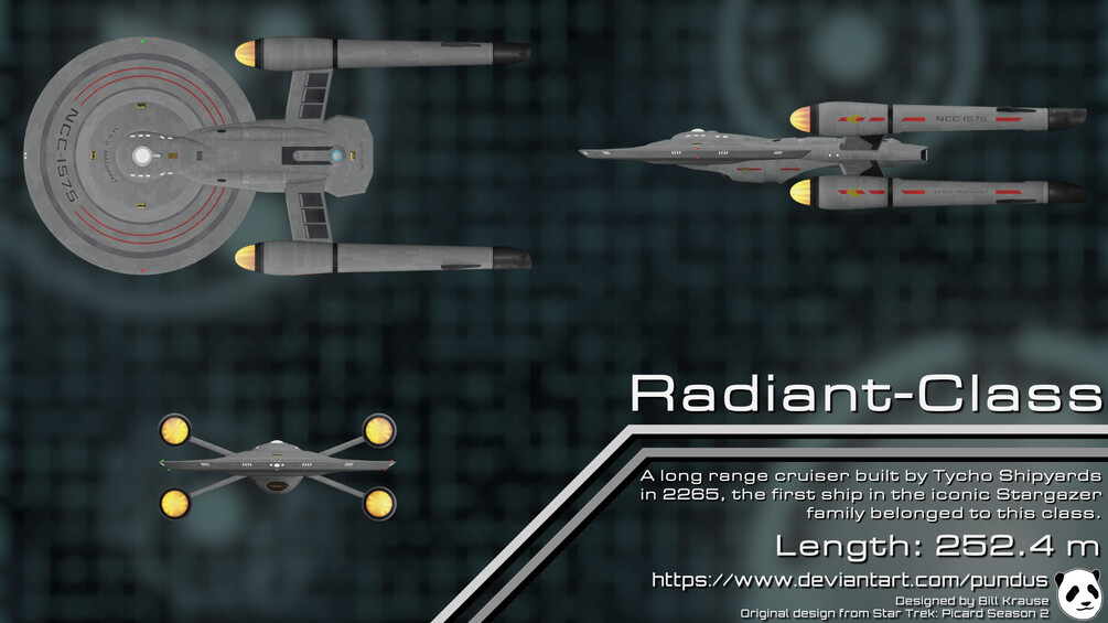 Long before the Sagan-Class USS Stargazer took flight at the dawn of the 25th century, and even before Picard's own command of the Constellation-Class Stargazer, there was a first USS Stargazer belonging to the Radiant-Class in the 23rd century. In service from 2265 to 2278, the Radiant-Class starship was built at Tycho shipyards, and bore the first in a line of Stargazers. In Star Trek: Picard's Season 2 opener, The Star Gazer, a golden model of the Radiant-Class Stargazer can be seen in the new Sagan-Class Stargazer's ready room in a wall alcove, alongside other golden models of the trio of Stargazers. The Radiant-Class was designed by Bill Krause.