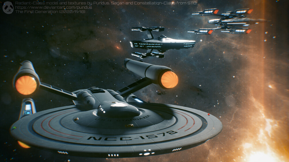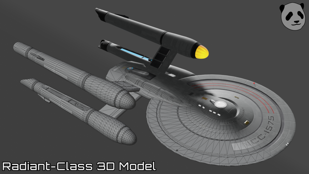 Comes as a packed Blender file with 4096 PBR textures. An FBX export is included. Textures are also included. Registries for the six Radiant-Class ships named by Bill Krause are included: USS Radiant NCC-1575, USS Fearless NCC-1576, USS Lysander NCC-1577, USS Stargazer NCC-1578, USS Ventura NCC-1579, USS Agility NCC-1580. The packed Blender files has the materials set up for rendering in Eevee. The native Blender file also includes animation for the bussards using an image sequence for the textures, which may initially appear as pink in the Blender file. Play it for a few frames to fix that.