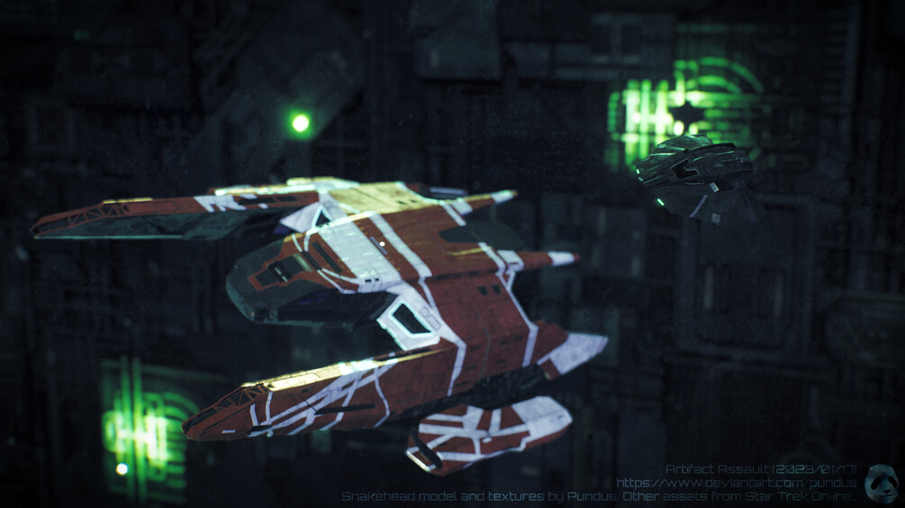 Aside from the canonical grey-black hull textures, an alternate texture set for the classic Romulan green livery is included.